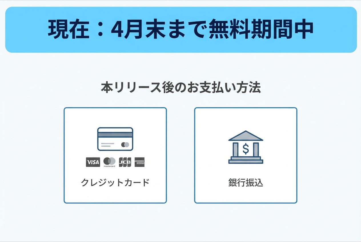 現在実施中の試験運用期間中は、参加費は無料のためお支払いは発生いたしません。本リリース後の料金およびお支払い方法につきましては、確定次第ご案内いたします。