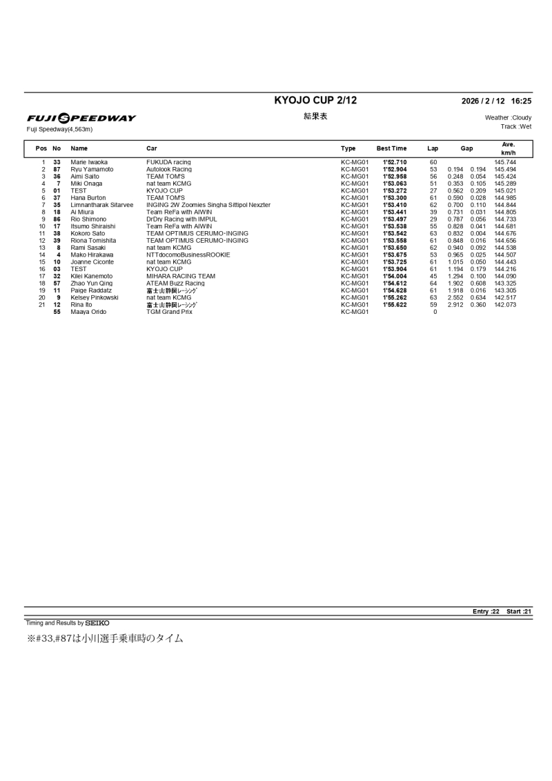 2026 KYOJO CUP 第1回合同テスト 2日目 総合結果
