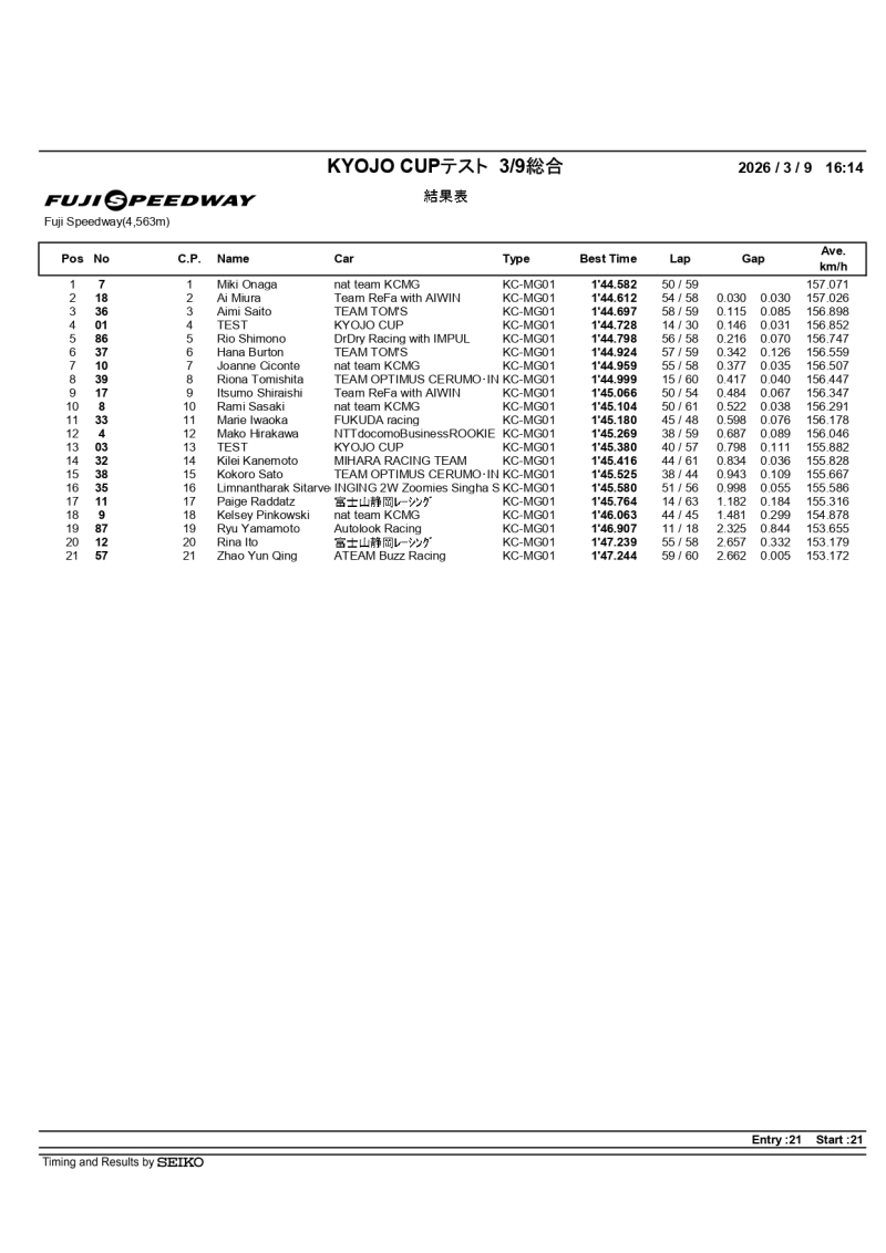 2026 KYOJO CUP 第1回合同テスト 1日目 総合結果