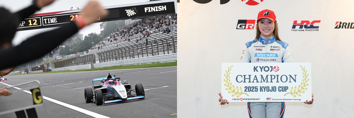 チャンピオン候補が下野、翁長の2名に絞られるなかで迎えた12周のKYOJO Finalは、12日(日)の12時55分からローリングスタートで開始された。トップの下野が加速で後続を引き離してレースをリードしようとするが、2番手の翁長もペースを上げて下野を猛追。ブレーキングで間合いを詰める翁長は下野との差を約0.6秒まで削るが、6周目のTGRコーナーでブレーキミスを喫し、再び差は拡大することに。ペースが落ちた翁長をかわした#1 斎藤愛未(BigBoss W TOM’S KYOJO with AIWIN KC-MG01)が2番手に浮上し、翁長は4番手を走行する#39 富下李央菜(OPTIMUS CERUMO・INGING KC-MG01)にも間合いを詰められていく。2台による3番手争いはファイナルラップに動きを見せ、翁長の背後についた富下がTGRコーナーで3番手に浮上した。トップを快走する下野は最後までペースを保ってチェッカーを受け、今季6勝目を飾るとともにフォーミュラ導入初年度のKYOJO CUPシリーズチャンピオンに輝いた。