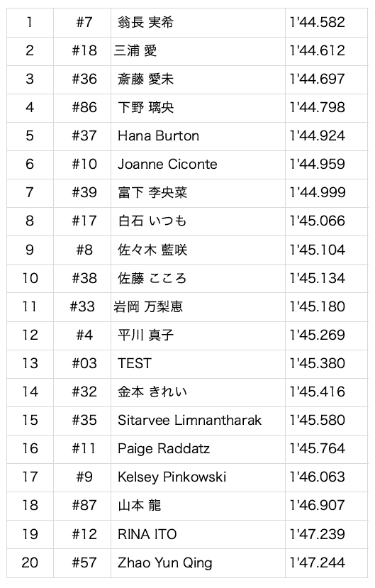 第2回合同テスト総合トップ:#7 翁長実希(nat team KCMG)